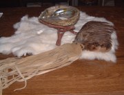 Smudging is the burning of certain herbs such as White Sage, Cedar, and Sweet Grass to create a cleansing smoke like bath , which is used to purify people, ceremonial and ritual space, and ceremonial tools and objects. We use Abalone shells or Clay bowls to burn the herbs in and a fan made if feathers in which we spread the smoke over the body or objects with. Like shown on the left.)